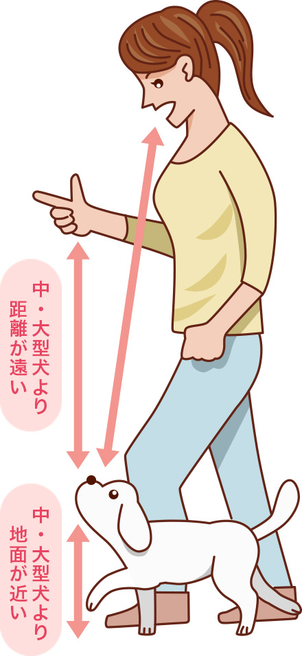 犬の動きは、人がオヤツ・オモチャをもった手で誘導したり、声で指示(コマンド)して行わせます。小型犬は体高が低いため、犬の口とオヤツをもつ人の手が遠く、人の声も聞きにくいということになります。