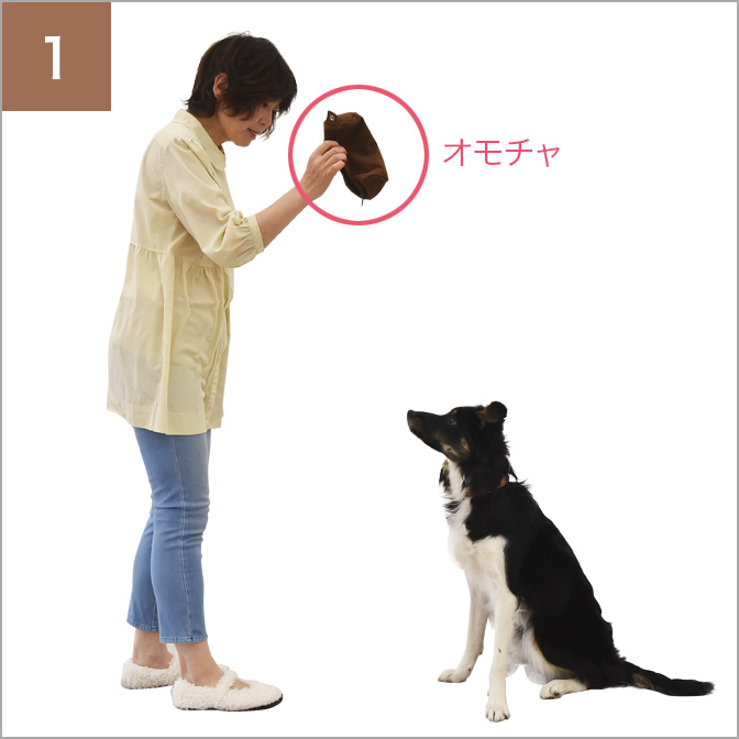 犬がタグトーイをくわえ、端を人が持ち、引っ張りっこすることで絆が生まれる。