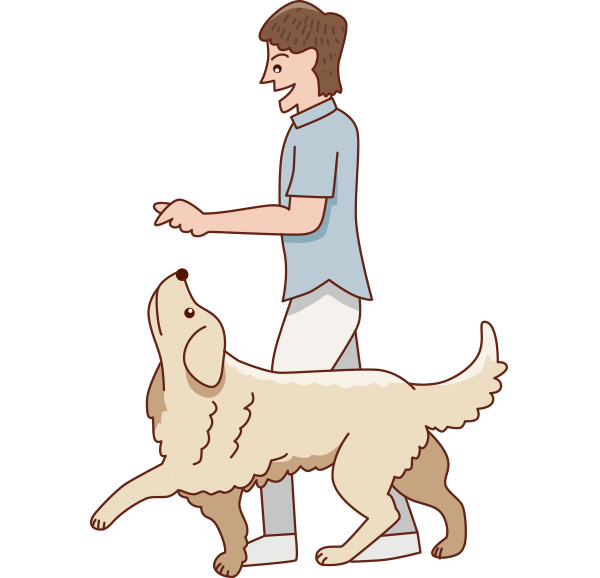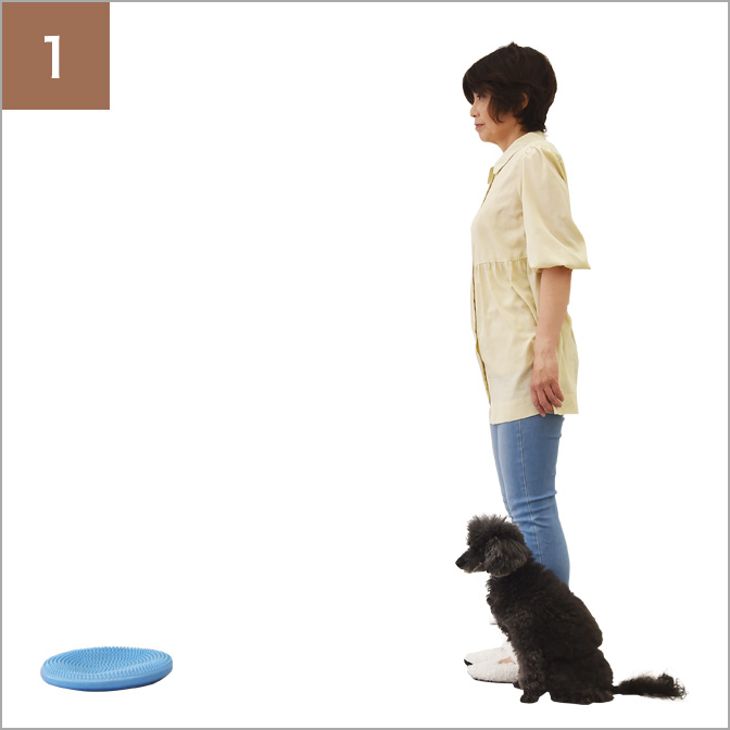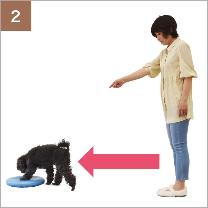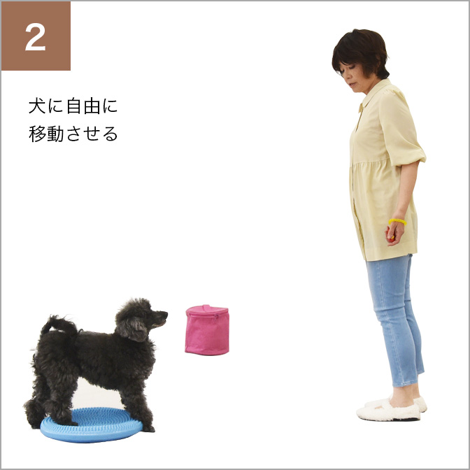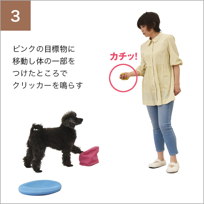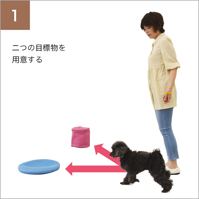 目標物を設定し、それに向けて犬が移動、体の一部・足などを接触させて動きを習得させる。