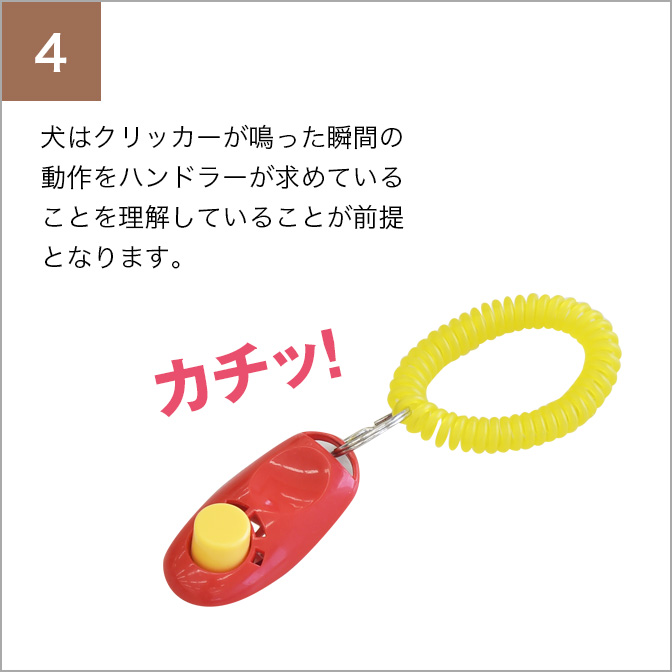 人の指示無しで犬が自発的に行った動作に対して、クリッカーを鳴らして強化していく。