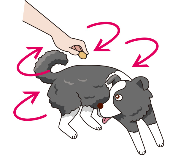 例/オヤツをもって、犬の目線の高さで円を描いて、お回りをさせる→ハンドサインがないと出来ない。
