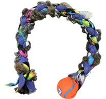 犬がタグトーイをくわえ、端を人が持ち、引っ張りっこすることで絆が生まれる。