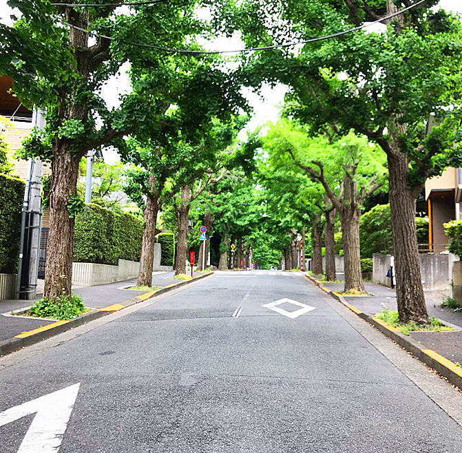 田園調布西口周辺の放射線状の道路。秋は美しいイチョウ並木になります