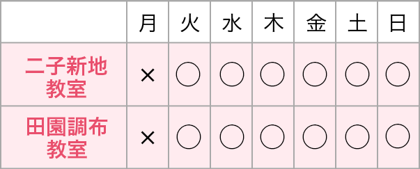 - ★スクールは、月曜日(祝日の場合も休み)が定休となっております。