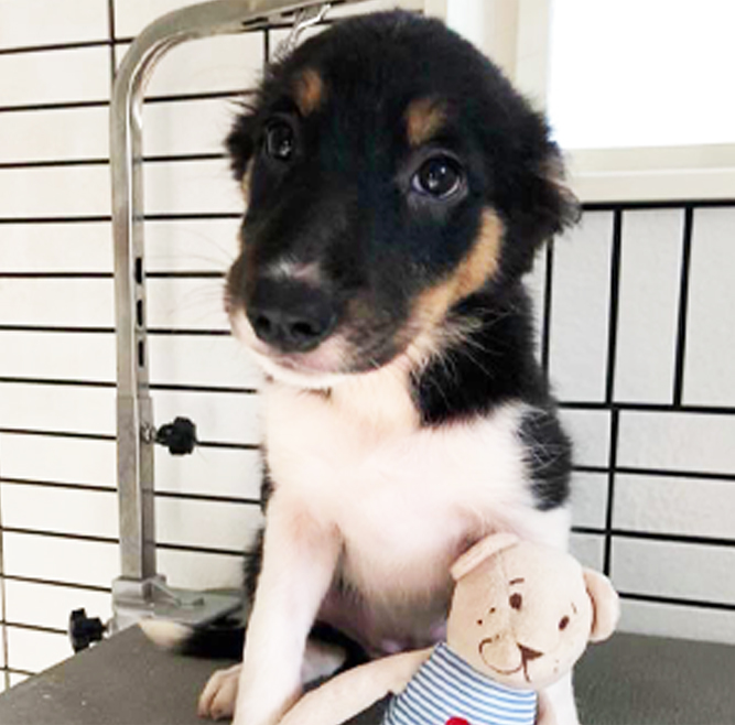 トライカラーで、眉毛くっきり、黒目がパッチリ、小顔で足長、容姿端麗といわれることも。FCIオビディエンスⅢ(世界大会レベル)に挑戦中。