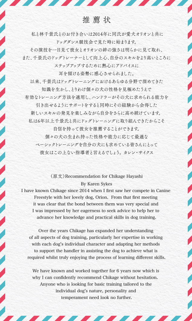 | 資格 | 一般社団法人 ジャパンケネルクラブ愛犬飼育管理士 公益社団法人 日本愛玩動物教会 愛玩動物飼養管理士 1級 一般社団法人 優良家庭犬普及協会 GCT(Good Citizen Test)合格 (※環境省が、知識及び技術を習得していることの証明として認めている資格(ドッグ・トレーナー必須の認可証「動物取扱業」認可時に必要)を複数所有しています。) 中学・高校英語教員資格 |
